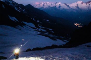 Still in the dark, we start the next morning at the Weissmieshütte and follow the path towards the Lagginhorn. As soon as it touches the glacial stream that flows down from the Lagginhorn glacier, we cross it and follow its bank until the terrain becomes steeper (the track itself goes up to the right towards the Hohsaas mountain station).