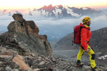 Here, we are heading straight towards the WSW ridge. After a glacier ascent of barely 20 minutes, we enter the rocky block ridge at the clearly recognizable, flattest spot. While we stow rope and glacier equipment back in our backpacks, we admire the sunrise and the alpenglow of the Mischabel group.